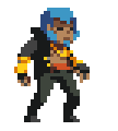 V is a slick, blue-haired, Russian gangster with experience fighting NULL soldiers with a side hobby of snuff filming and probably pornography. He carries a gold plated pistol, a pair of gold painted steel gauntlets, which is capable of blocking bullets and sword strikes and golden teeth as it's shown on his Steam Trading Card Artwork and in-game several times. He is kidnapped by Fifteen after the Mansion mission, his arms being severed beforehand by the Swordsman, and is stated by Snow to have been killed in Katana Zero's credit sequence, sitting motionlessly in a chair at Fifteens hideout.